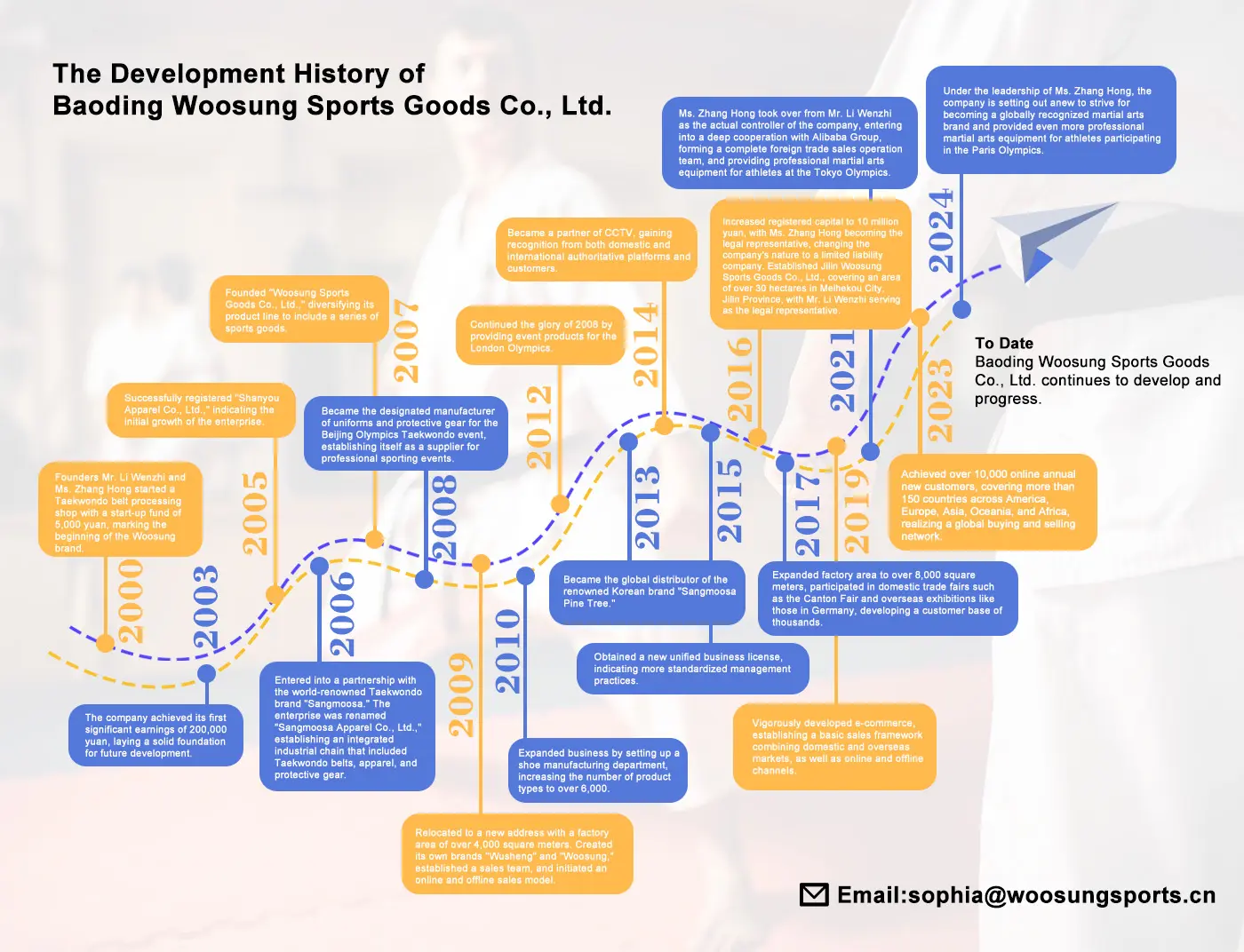 В 2016 году Woosung Sports Goods увеличила свой зарегистрированный капитал до 10 миллионов юаней, а г -жа Чжан Хонг стала юридическим представителем, переведя компанию в организацию с ограниченной ответственностью. К 2017 году компания расширила свою заводскую область до более чем 8000 квадратных метров, участвовая в многочисленных внутренних и международных торговых ярмарках, таких как ярмарка Canton в Китае, и выставки в Германии, развивая отношения с более чем тысячами клиентов.